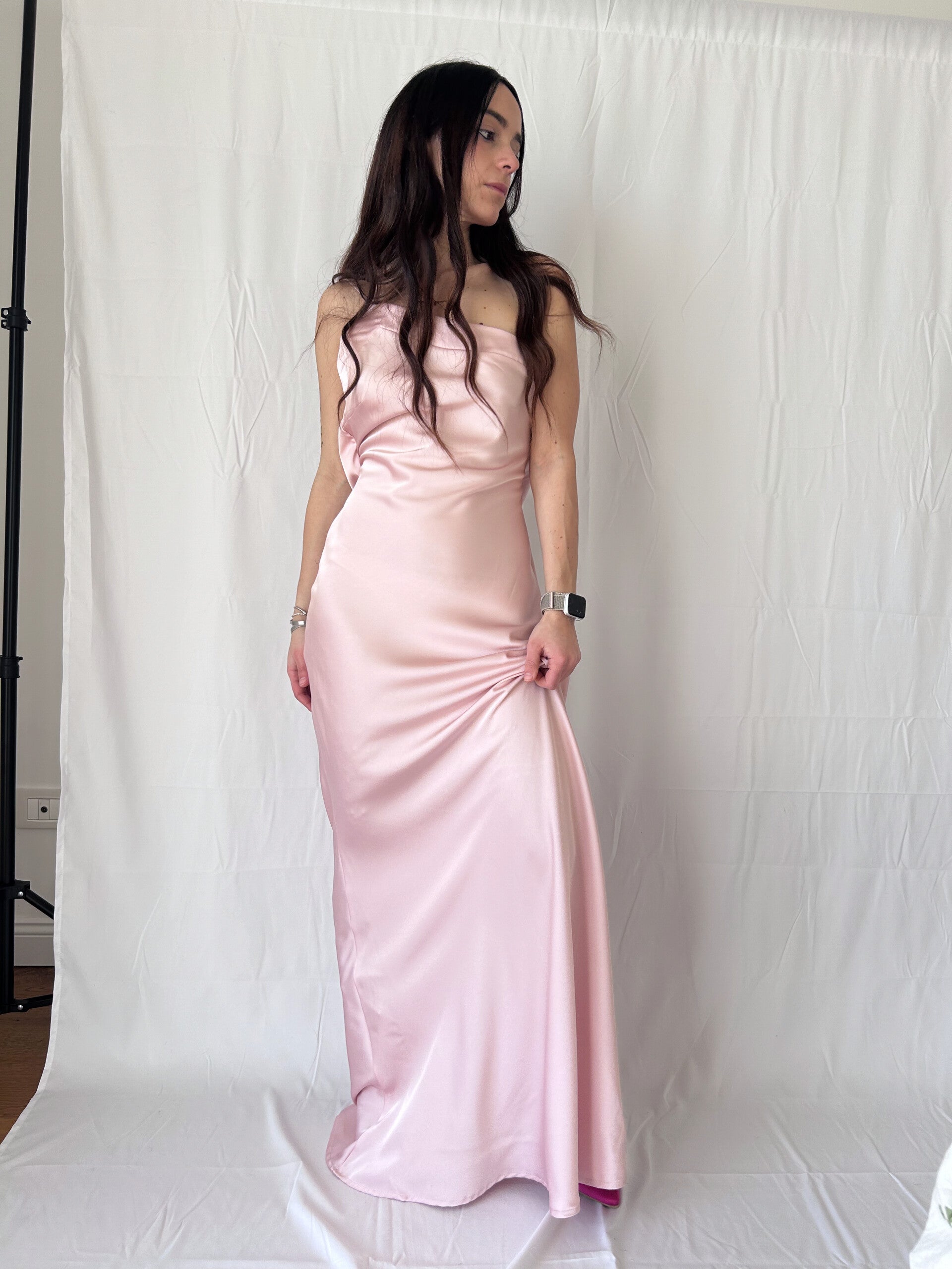 Vestito monospalla in satin , realizzabile in diverse colorazioni. Tessuto molto morbido al tatto e fresco.